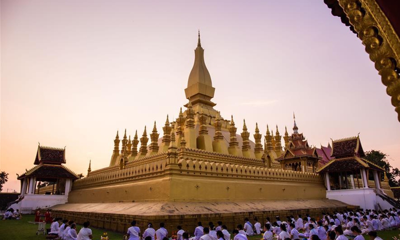 People pray around That Luang Stupa in Vientiane, Laos, on Sept. 2, 2020. As the coutry's COVID-19 pandemic situation is eased, the daily life in Lao capital Vientiane is returning to normal. (Photo by Kaikeo Saiyasane/Xinhua)