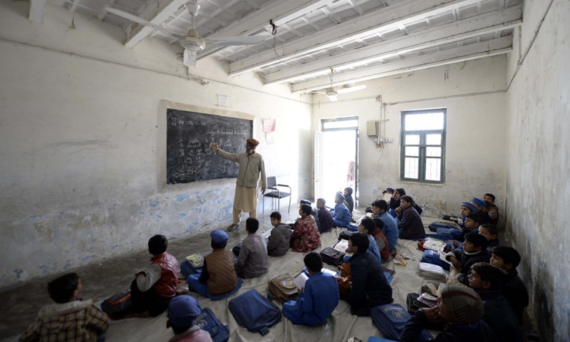 Afghan children attend a class at a refugee camp in northwest Pakistan's Peshawar on Feb. 14, 2020. (Xinhua/Ahmad Kamal)