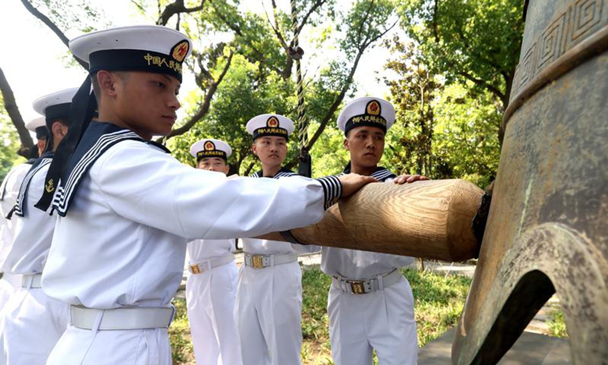 People's Liberation Army Navy soldiers strike a bell to commemorate the 75th anniversary of the victory of the Chinese People's War of Resistance Against Japanese Aggression and the World Anti-Fascist War in Shanghai, Sept 3, 2020. Photo: Xinhua