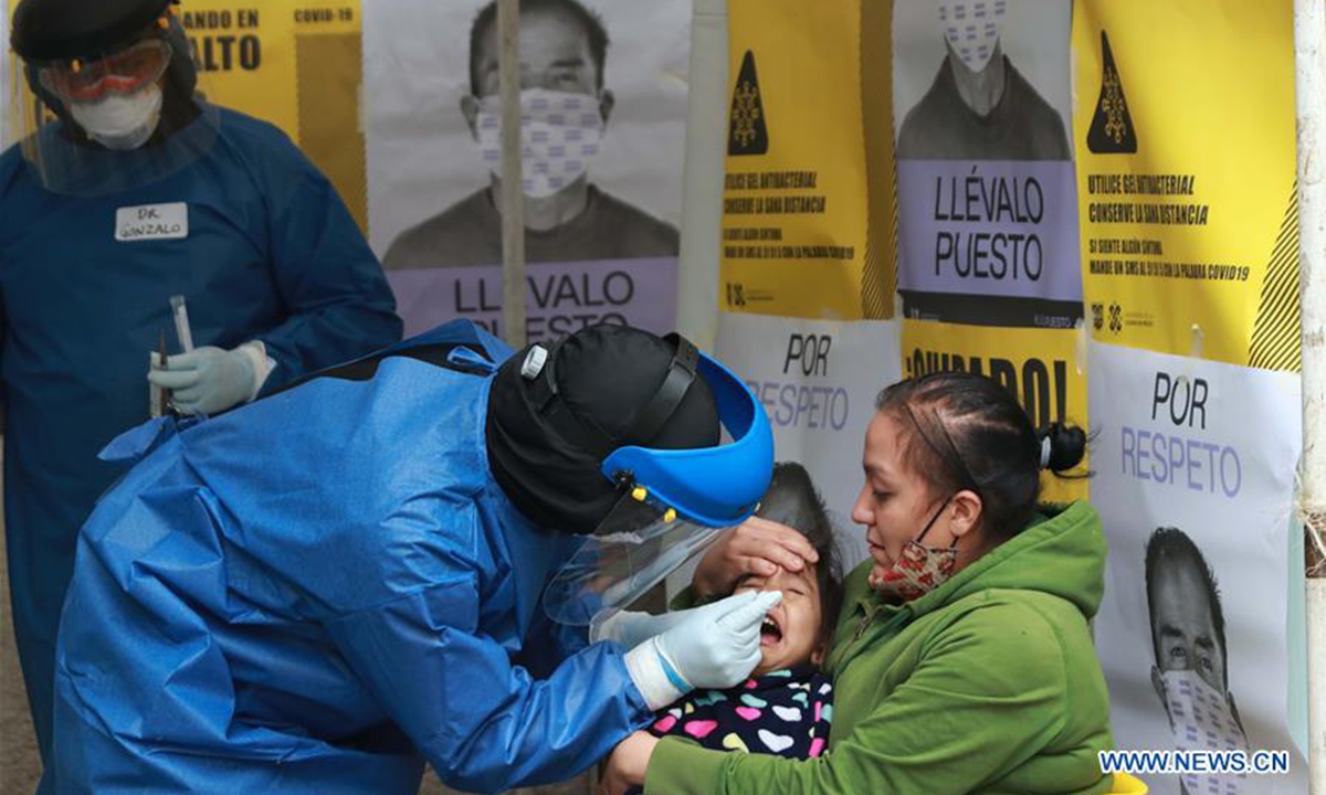 A medical worker takes a swab sample from a child for COVID-19 test amid the pandemic in Mexico City, Mexico, Aug. 26, 2020. (Photo by Israel Rosas/Xinhua)