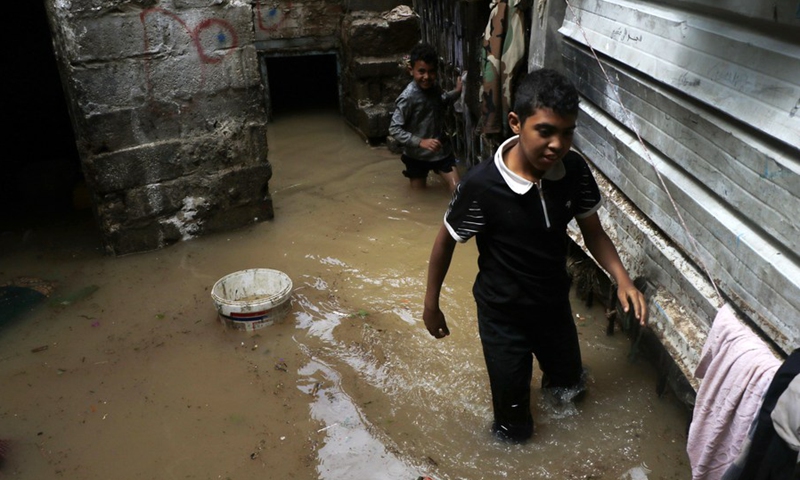 Children walk at their flooded house after heavy rains in Sanaa, Yemen, on Aug. 7, 2020. (Photo by Mohammed Mohammed/Xinhua)
