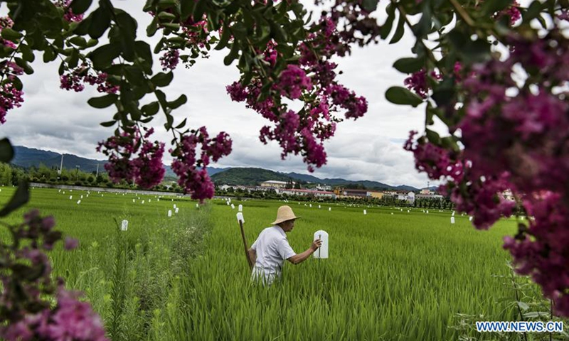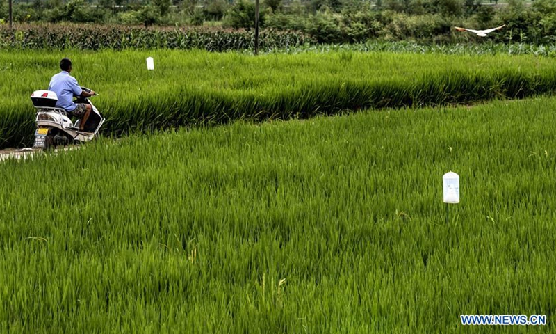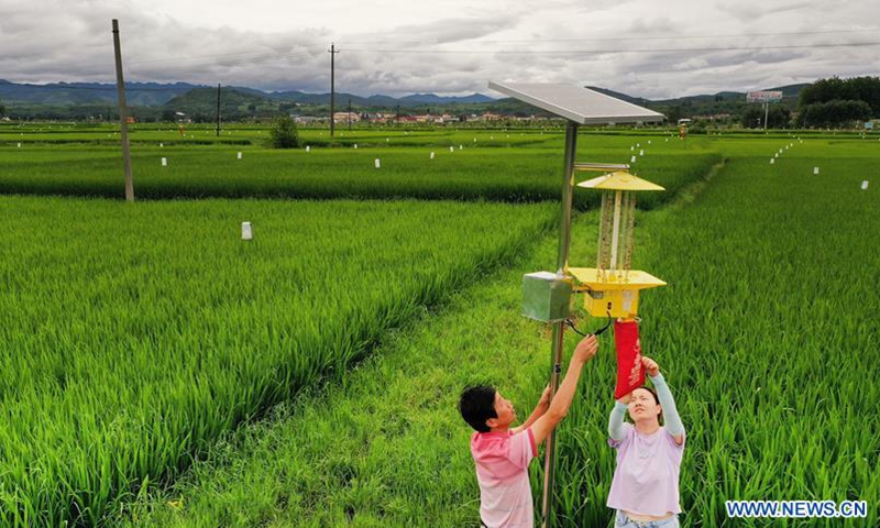 An agricultural technician checks on the light traps for insects in the paddy field of Zhoujiakan Village in Yangxian County, northwest China's Shaanxi Province, July 15, 2020. On May 23, 1981, the world's last seven wild crested ibises were found in Yangxian County. In order to protect crested Ibis, the local government encourages farmers not to use chemical fertilizers and pesticides in the farmland in the crested Ibis habitats. Yangxian had chosen organic industry as a way to solve the contradiction between protecting ecological environment and crested ibis and developing economy. Taking the "organic" strategy, Yangxian takes ecological conservation as its first requirement. Crested ibis, which was nearly extinct, has multiplied from the original seven to more than 5,000 in the global population, of which more than 2,000 are in Yangxian. The long-term accumulation of ecological asset in Yangxian County has also gradually released huge economic potential. Organic industry has not only become the top priority of county economic and social development, but also the leading industry to drive the poor out of poverty.Photo:Xinhua