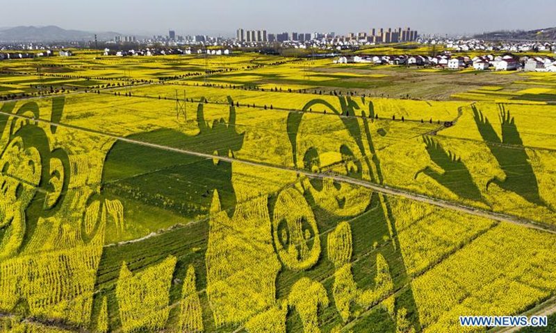 Photo taken on March 14, 2020 shows a graphic field in Yangxian County, northwest China's Shaanxi Province. On May 23, 1981, the world's last seven wild crested ibises were found in Yangxian County. In order to protect crested Ibis, the local government encourages farmers not to use chemical fertilizers and pesticides in the farmland in the crested Ibis habitats. Yangxian had chosen organic industry as a way to solve the contradiction between protecting ecological environment and crested ibis and developing economy. Taking the "organic" strategy, Yangxian takes ecological conservation as its first requirement. Crested ibis, which was nearly extinct, has multiplied from the original seven to more than 5,000 in the global population, of which more than 2,000 are in Yangxian. The long-term accumulation of ecological asset in Yangxian County has also gradually released huge economic potential. Organic industry has not only become the top priority of county economic and social development, but also the leading industry to drive the poor out of poverty.Photo:Xinhua