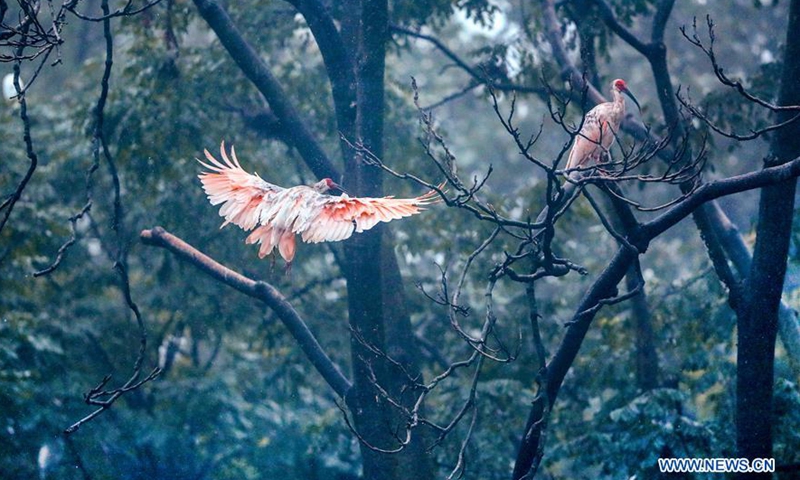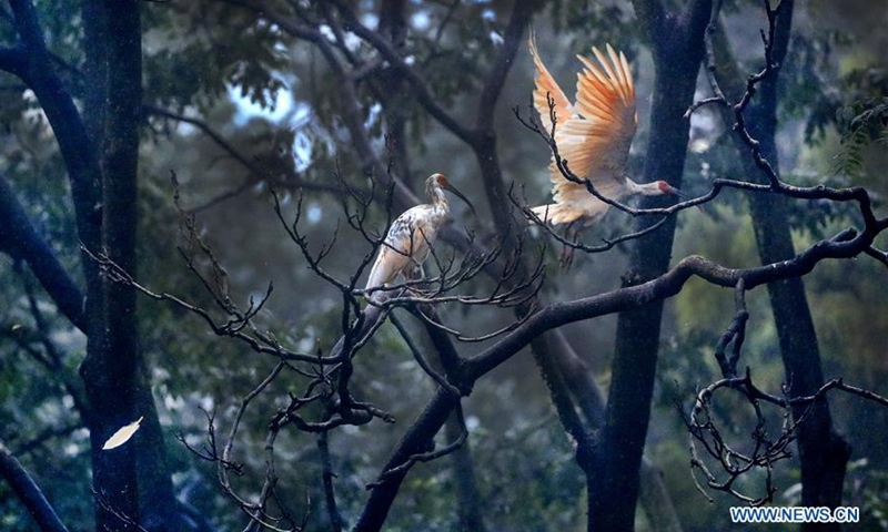 Crested ibises are seen near Chenjiacun Village in Yangxian County, northwest China's Shaanxi Province, Aug 1, 2020. On May 23, 1981, the world's last seven wild crested ibises were found in Yangxian County. In order to protect crested Ibis, the local government encourages farmers not to use chemical fertilizers and pesticides in the farmland in the crested Ibis habitats. Yangxian had chosen organic industry as a way to solve the contradiction between protecting ecological environment and crested ibis and developing economy. Taking the "organic" strategy, Yangxian takes ecological conservation as its first requirement. Crested ibis, which was nearly extinct, has multiplied from the original seven to more than 5,000 in the global population, of which more than 2,000 are in Yangxian. The long-term accumulation of ecological asset in Yangxian County has also gradually released huge economic potential. Organic industry has not only become the top priority of county economic and social development, but also the leading industry to drive the poor out of poverty.Photo:Xinhua
