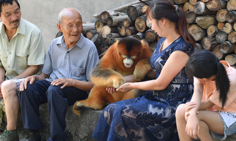 A golden monkey interacts with villagers in Maoping Village in Yangxian County, northwest China's Shaanxi Province, Aug. 2, 2020. On May 23, 1981, the world's last seven wild crested ibises were found in Yangxian County. In order to protect crested Ibis, the local government encourages farmers not to use chemical fertilizers and pesticides in the farmland in the crested Ibis habitats. Yangxian had chosen organic industry as a way to solve the contradiction between protecting ecological environment and crested ibis and developing economy. Taking the "organic" strategy, Yangxian takes ecological conservation as its first requirement. Crested ibis, which was nearly extinct, has multiplied from the original seven to more than 5,000 in the global population, of which more than 2,000 are in Yangxian. The long-term accumulation of ecological asset in Yangxian County has also gradually released huge economic potential. Organic industry has not only become the top priority of county economic and social development, but also the leading industry to drive the poor out of poverty.Photo:Xinhua