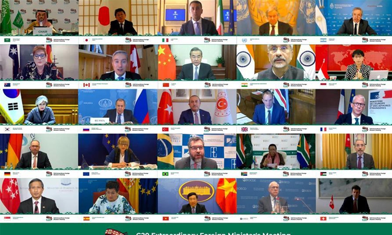 Photo taken on Sept. 3, 2020 in Riyadh, Saudi Arabia shows G20 foreign ministers attending the virtual G20 Extraordinary Foreign Minister's Meeting. The Group of 20 (G20) foreign ministers highlighted on Thursday coordination of cross-border management to protect lives and livelihoods during coronavirus crisis, according to a statement by the Saudi G20 Presidency.Photo:Xinhua