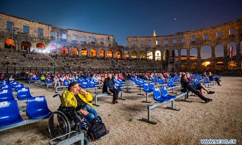 People watch the screen in the ancient amphitheatre during the 67th Pula Film Festival in Pula, Croatia, Sept. 1, 2020. Pula Film Festival was established in 1954. This year's festival is held from Aug. 29 to Sept. 4 with epidemiological measures against COVID-19.Photo:Xinhua
