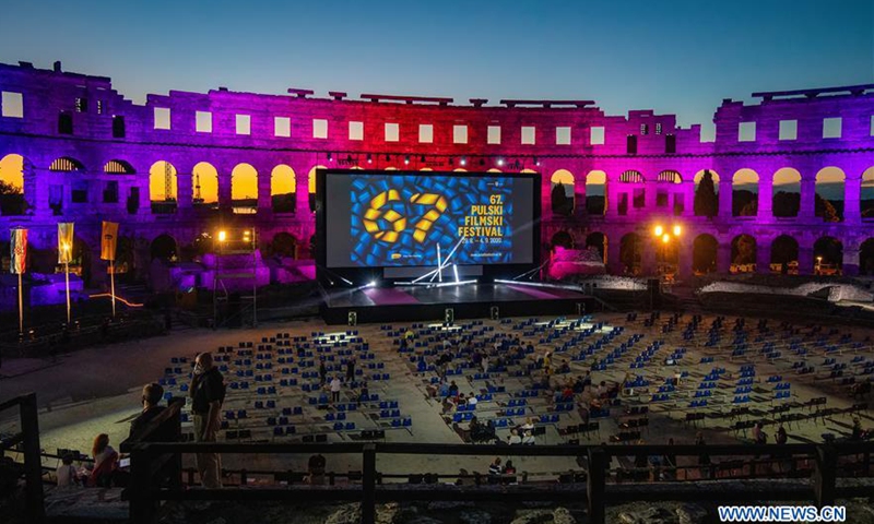 The ancient amphitheatre is lit in colors during the 67th Pula Film Festival in Pula, Croatia, Sept. 1, 2020. Pula Film Festival was established in 1954. This year's festival is held from Aug. 29 to Sept. 4 with epidemiological measures against COVID-19. Photo:Xinhua