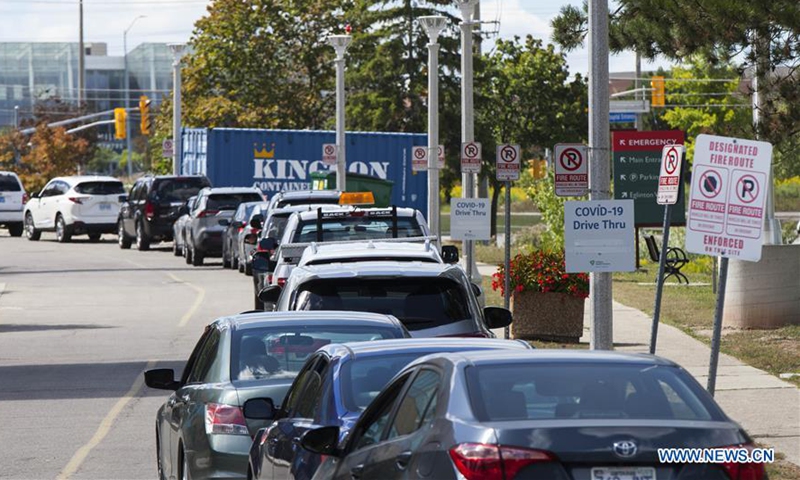 People wait in their vehicles to have COVID-19 tests outside a drive-thru COVID-19 assessment center in Mississauga, Ontario, Canada, on Sept. 4, 2020. There have been 130,493 cases of COVID-19 in Canada, including 9,141 deaths. (Photo by Zou Zheng/Xinhua)