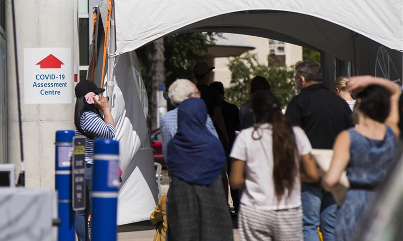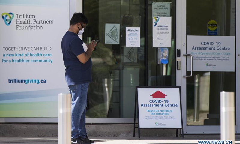 A man wearing a face mask waits to have his COVID-19 test outside a COVID-19 assessment center in Mississauga, Ontario, Canada, on Sept. 4, 2020. There have been 130,493 cases of COVID-19 in Canada, including 9,141 deaths. (Photo by Zou Zheng/Xinhua)