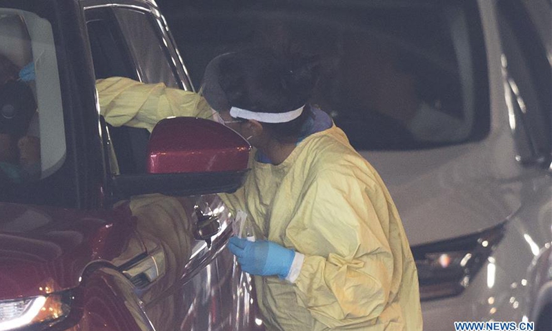 A medical worker collects a sample at a drive-thru COVID-19 assessment center in Mississauga, Ontario, Canada, on Sept. 4, 2020. There have been 130,493 cases of COVID-19 in Canada, including 9,141 deaths. (Photo by Zou Zheng/Xinhua)
