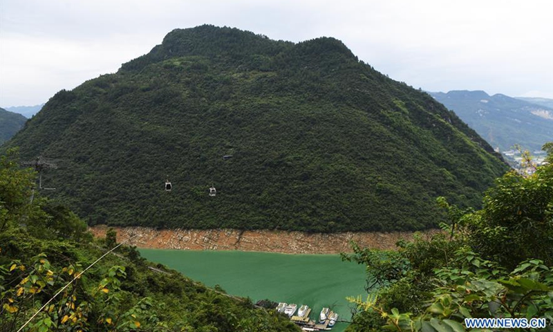 Tourists take cable cars to visit Furongdong scenic area in Wulong District, southwest China's Chongqing, Sept. 3, 2020. Wulong carries out ecological-tourism according to its mountainous environment in recent years. By improving the accommodation level and capacity of the villages, rural tourism has been developed, which helps people here get rid of poverty without working far away from home.Photo:Xinhua