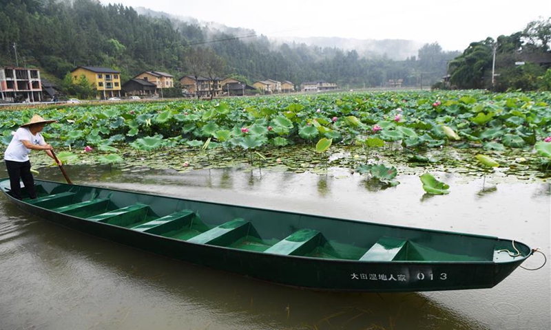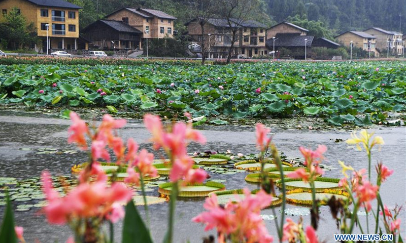Photo taken on Sept. 4, 2020 shows a lotus pond at a scenic area in Canggou Township in Wulong District, southwest China's Chongqing. Wulong carries out ecological-tourism according to its mountainous environment in recent years. By improving the accommodation level and capacity of the villages, rural tourism has been developed, which helps people here get rid of poverty without working far away from home.Photo:Xinhua