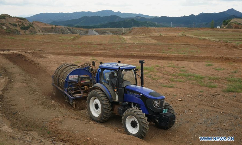 A man works in a field for sowing after restoration of a disused mine in Maquanzi Town of Qinglong Manchu Autonomous County, north China's Hebei Province, Sept. 5, 2020. In recent years, Qinglong Manchu Autonomous County has focused on restoring open pits and reclaimed 8,762 mu (about 584 hectares) of land. (Xinhua/Yang Shiyao)