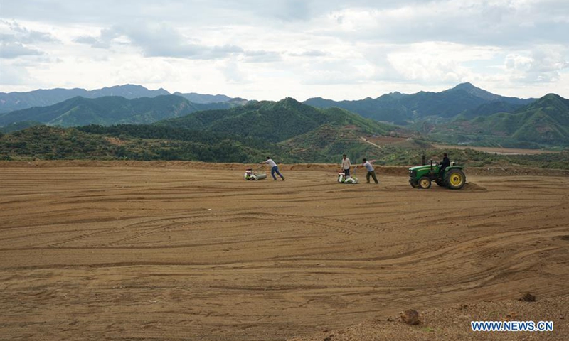Photo shows a field for sowing after restoration of a disused mine in Maquanzi Town of Qinglong Manchu Autonomous County, north China's Hebei Province, Sept. 5, 2020. In recent years, Qinglong Manchu Autonomous County has focused on restoring open pits and reclaimed 8,762 mu (about 584 hectares) of land. (Xinhua/Yang Shiyao)