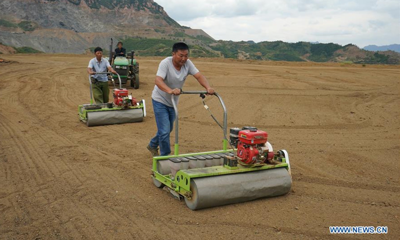 People sow grass seeds in the field restored from a disused mine in Maquanzi Town of Qinglong Manchu Autonomous County, north China's Hebei Province, Sept. 5, 2020. In recent years, Qinglong Manchu Autonomous County has focused on restoring open pits and reclaimed 8,762 mu (about 584 hectares) of land. (Xinhua/Yang Shiyao)