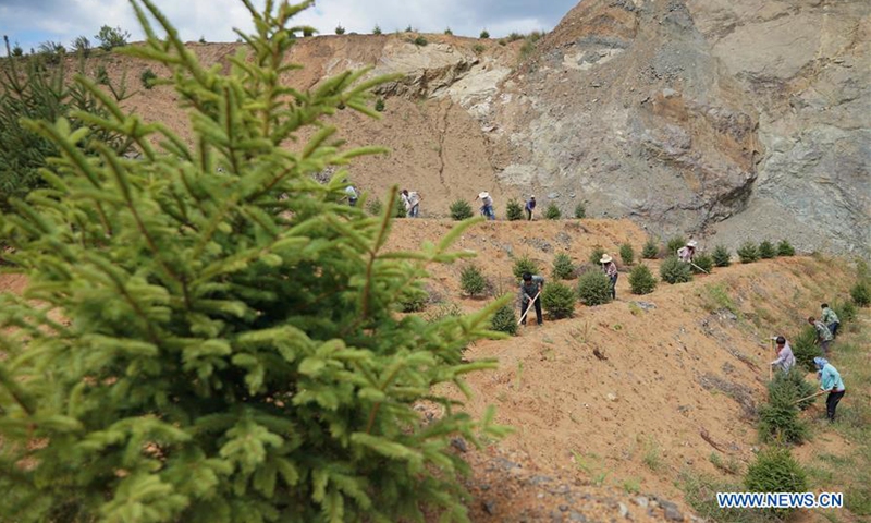 People work at a restoration site of a disused mine in Maquanzi Town of Qinglong Manchu Autonomous County, north China's Hebei Province, Sept. 5, 2020. In recent years, Qinglong Manchu Autonomous County has focused on restoring open pits and reclaimed 8,762 mu (about 584 hectares) of land. (Xinhua/Yang Shiyao)