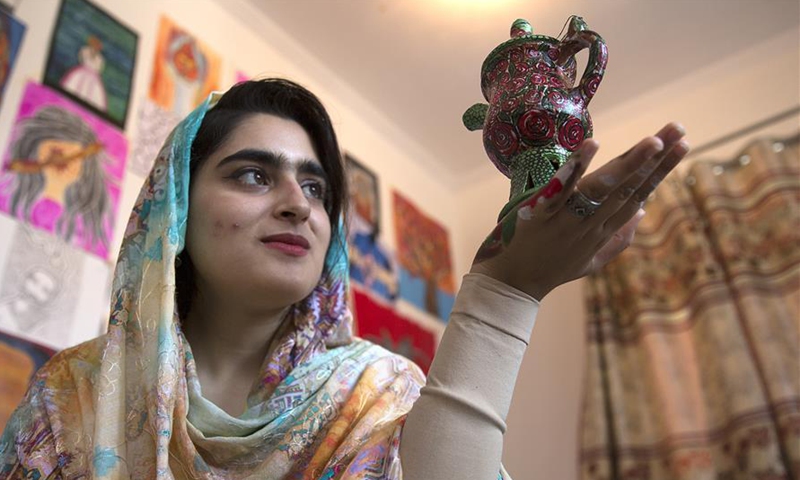 The 25-year-old artist Shafiya Shafi displays a painted earthen pot at her home in Srinagar city, the summer capital of Indian-controlled Kashmir, Sept. 5, 2020. (Xinhua/Javed Dar)