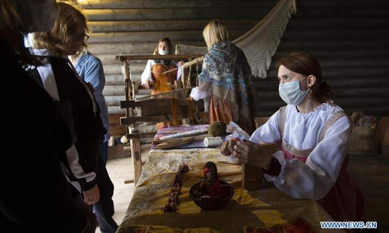 Staff members wearing face masks and traditional costumes perform during a Moscow City Day cultural event at Kolomenskoye park in Moscow, Russia, Sept. 5, 2020. Celebrations for the 873rd anniversary of Moscow were downsized to a number of cultural events held at different venues around the city to prevent the spread of COVID-19. (Photo by Alexander Zemlianichenko Jr/Xinhua)