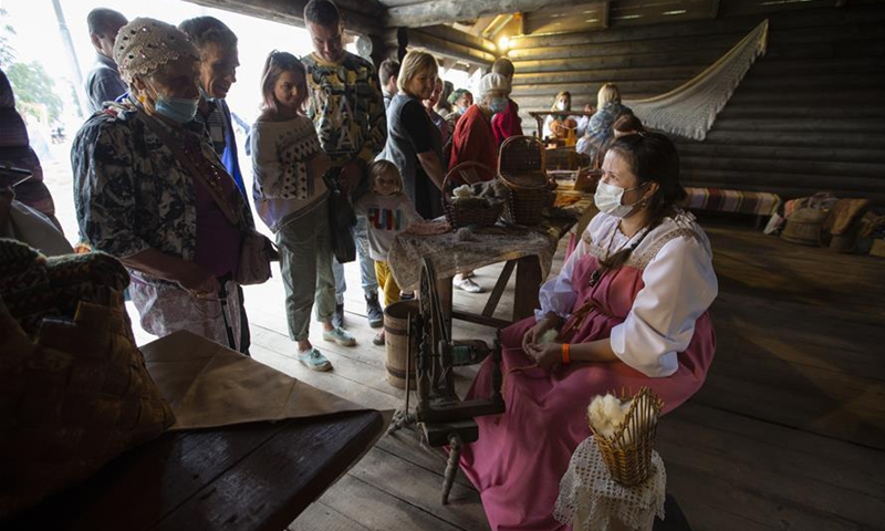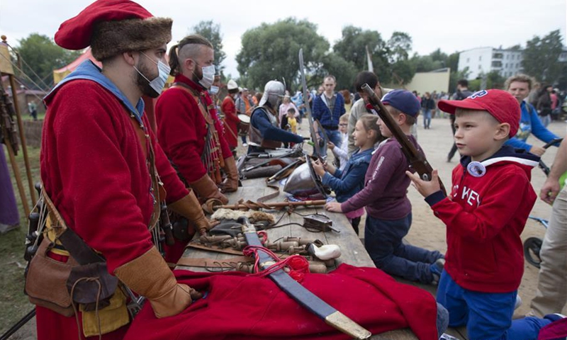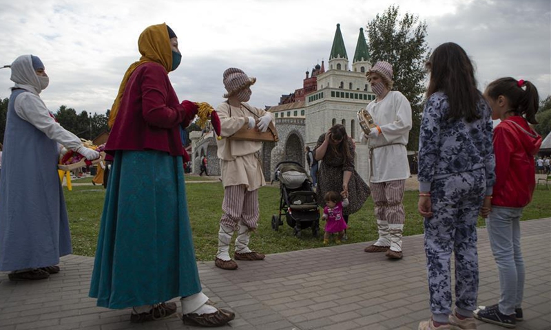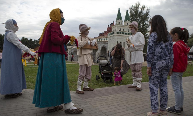 People visit a Moscow City Day cultural event at Kolomenskoye park in Moscow, Russia, Sept. 5, 2020. Celebrations for the 873rd anniversary of Moscow were downsized to a number of cultural events held at different venues around the city to prevent the spread of COVID-19. (Photo by Alexander Zemlianichenko Jr/Xinhua)