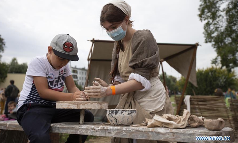 A staff member wearing a face mask and traditional costumes makes pottery with a young visitor during a Moscow City Day cultural event at Kolomenskoye park in Moscow, Russia, Sept. 5, 2020. Celebrations for the 873rd anniversary of Moscow were downsized to a number of cultural events held at different venues around the city to prevent the spread of COVID-19. (Photo by Alexander Zemlianichenko Jr/Xinhua)