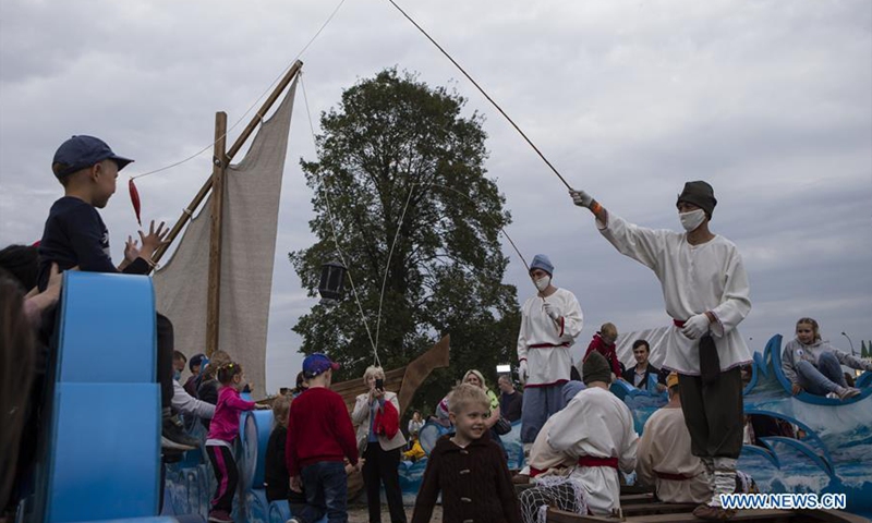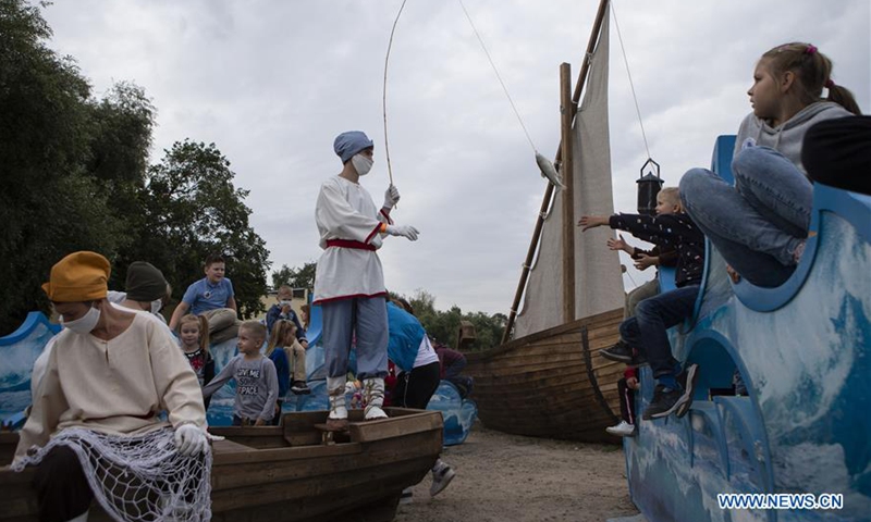 A staff member wearing a face mask and traditional costumes entertains young visitors with a fishing rod during a Moscow City Day cultural event at Kolomenskoye park in Moscow, Russia, Sept. 5, 2020. Celebrations for the 873rd anniversary of Moscow were downsized to a number of cultural events held at different venues around the city to prevent the spread of COVID-19. (Photo by Alexander Zemlianichenko Jr/Xinhua)