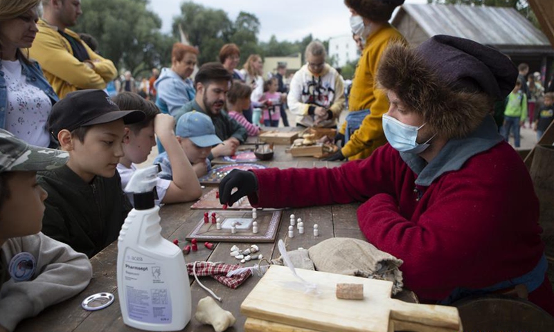 Staff members wearing face masks and traditional costumes play board games with young visitors during a Moscow City Day cultural event at Kolomenskoye park in Moscow, Russia, Sept. 5, 2020. Celebrations for the 873rd anniversary of Moscow were downsized to a number of cultural events held at different venues around the city to prevent the spread of COVID-19. (Photo by Alexander Zemlianichenko Jr/Xinhua)