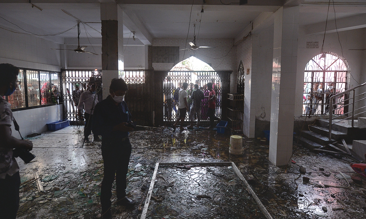 Shattered glass is seen inside a mosque following a fire in the central district of Narayanganj, Bangladesh on Saturday. Photo: AFP