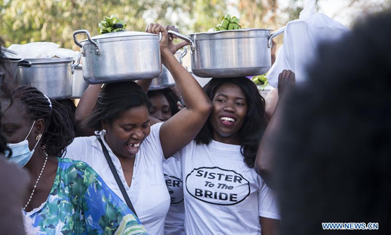 Family members of the bride deliver food to the groom during the Icilanga Mulilo ceremony in Lusaka, capital of Zambia, Sept. 5, 2020. Icilanga Mulilo, traditionally practised by Bemba speaking people of Zambia, is a ceremony prior to a wedding where the groom is introduced to foods prepared by the bride's family. (Photo by Martin Mbangweta/Xinhua)