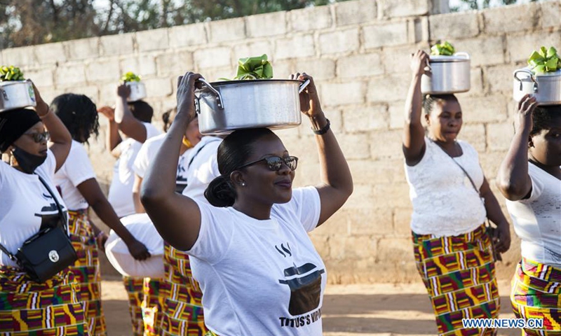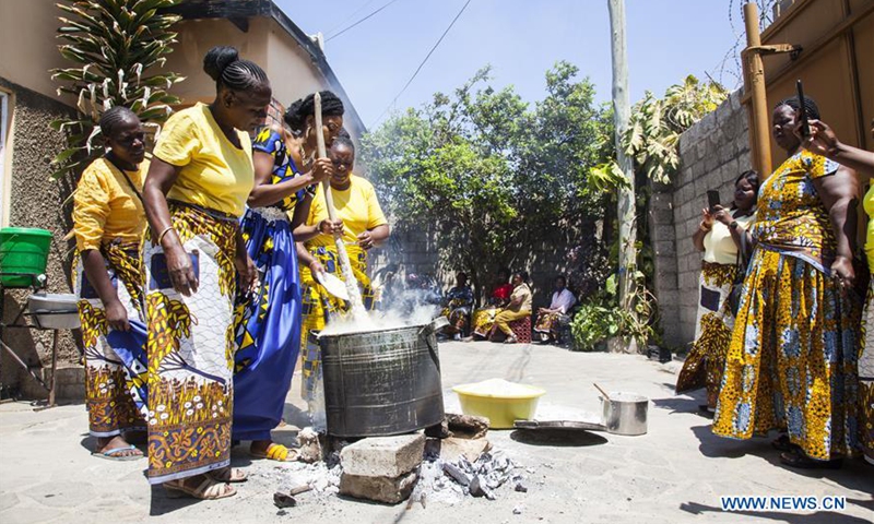 Family members of the bride prepare food during the Icilanga Mulilo ceremony in Lusaka, capital of Zambia, Sept. 5, 2020. Icilanga Mulilo, traditionally practised by Bemba speaking people of Zambia, is a ceremony prior to a wedding where the groom is introduced to foods prepared by the bride's family. (Photo by Martin Mbangweta/Xinhua)