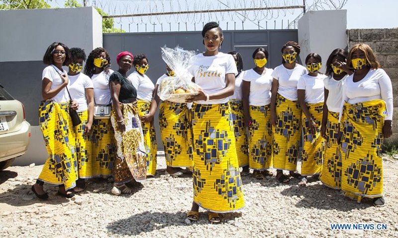 A bride poses with her bridesmaids during the Icilanga Mulilo ceremony in Lusaka, capital of Zambia, Sept. 5, 2020. Icilanga Mulilo, traditionally practised by Bemba speaking people of Zambia, is a ceremony prior to a wedding where the groom is introduced to foods prepared by the bride's family. (Photo by Martin Mbangweta/Xinhua)