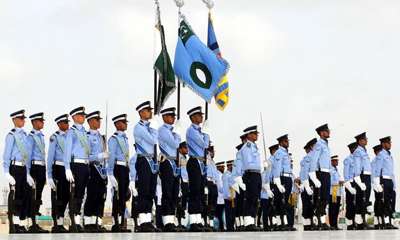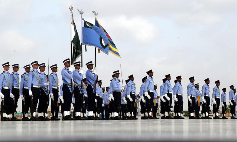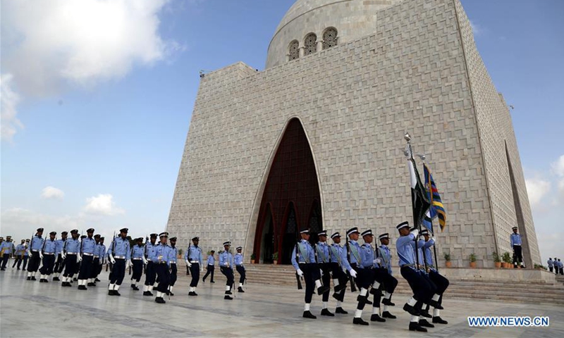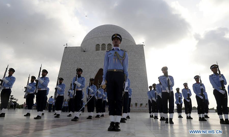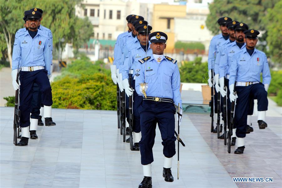 Pakistan Air Force cadets take part in a ceremony at the mausoleum of the country's founder Muhammad Ali Jinnah to mark the country's Defense Day in southern Pakistani port city of Karachi on Sept. 6, 2020. Pakistan celebrated the country's 55th Defense Day on Sunday to pay homage to the soldiers and civilians who lost their lives in the war with India in 1965. (Str/Xinhua)