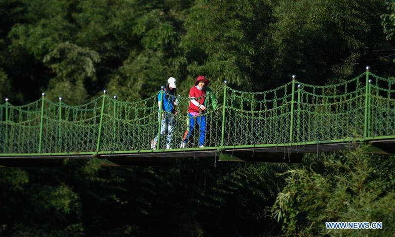 Tourists walk on a suspension bridge at Luci Village in Fuchunjiang Town of Tonglu County, east China's Zhejiang Province, Sept. 6, 2020. In recent years, the Tonglu County has invested in building a rural slow-paced life experiencing area at Fuchunjiang Town, which is based on the town's some beautiful villages and renowned scenic spots. (Xinhua/Huang Zongzhi)