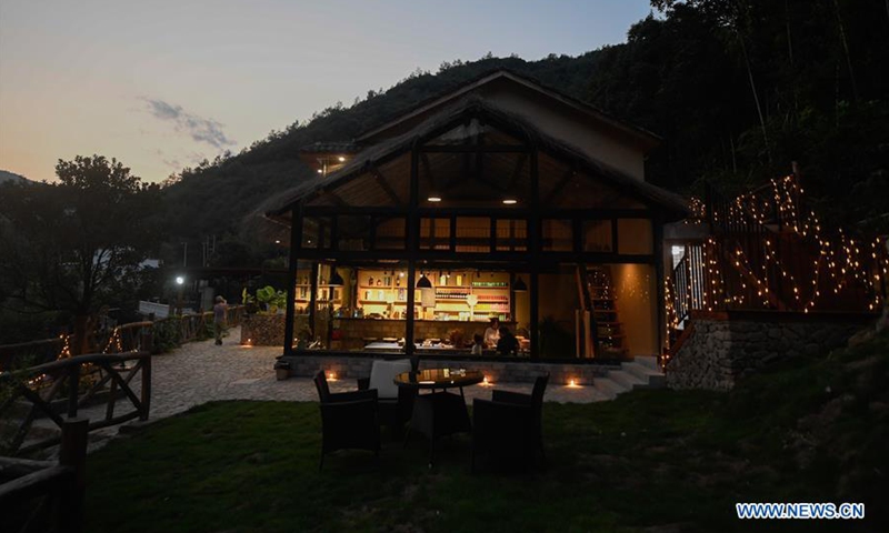 Photo taken on Sept. 5, 2020 shows a lighted rural inn at Fuchunjiang Town in Tonglu County, east China's Zhejiang Province. In recent years, the Tonglu County has invested in building a rural slow-paced life experiencing area at Fuchunjiang Town, which is based on the town's some beautiful villages and renowned scenic spots. (Xinhua/Huang Zongzhi)