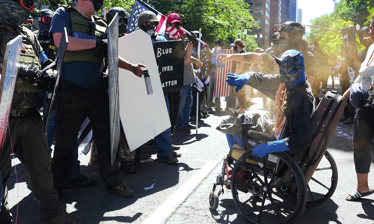 Right-wing protesters pepper spray an anti-police protester during a rally in Portland on August 22. Photo: AFP