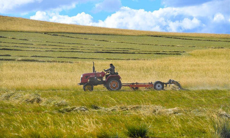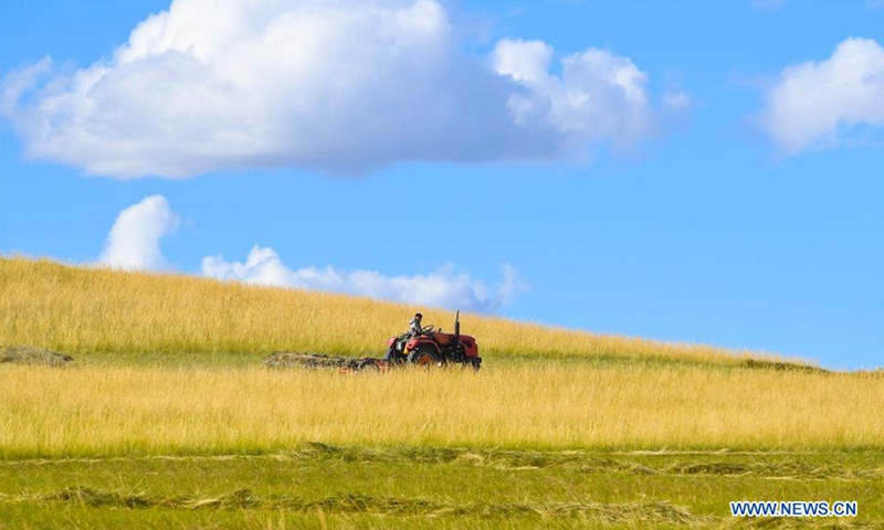 A herdsman operates a machine to mow grass on a grassland in Xilin Gol League, north China's Inner Mongolia Autonomous Region, Sept. 7, 2020. The pastoral area in Xilin Gol has entered into its grass mowing season. (Xinhua/Peng Yuan)