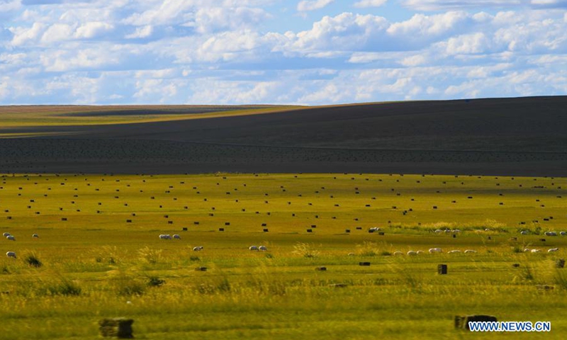 Bundles of grass which have been mowed are seen on a grassland in Xilin Gol League, north China's Inner Mongolia Autonomous Region, Sept. 7, 2020. The pastoral area in Xilin Gol has entered into its grass mowing season. (Xinhua/Peng Yuan)