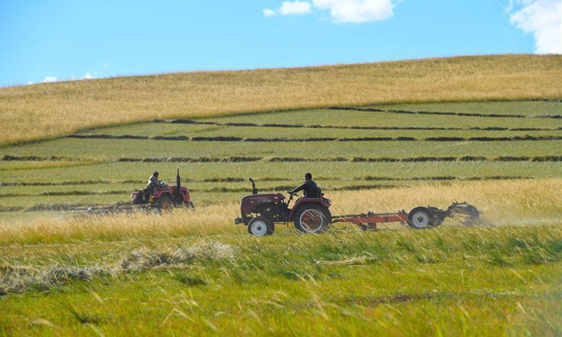 Herdsmen operate machines to mow grass on a grassland in Xilin Gol League, north China's Inner Mongolia Autonomous Region, Sept. 7, 2020. The pastoral area in Xilin Gol has entered into its grass mowing season. (Xinhua/Peng Yuan)