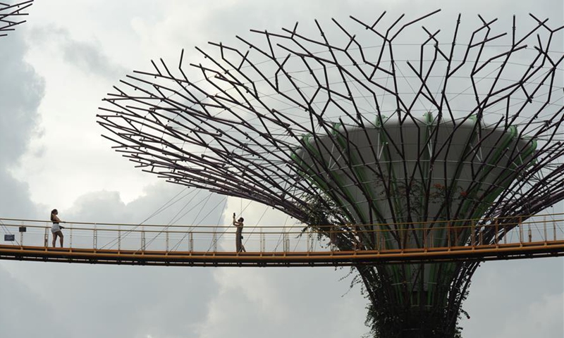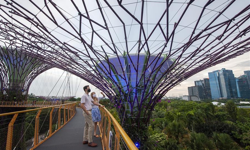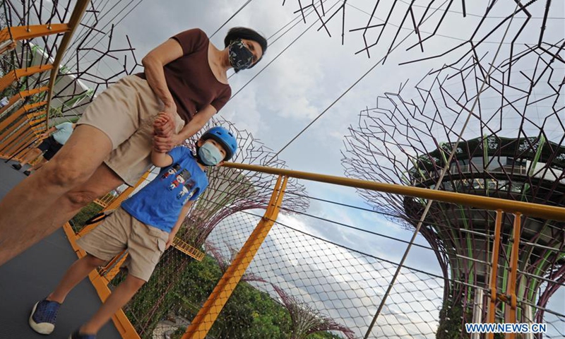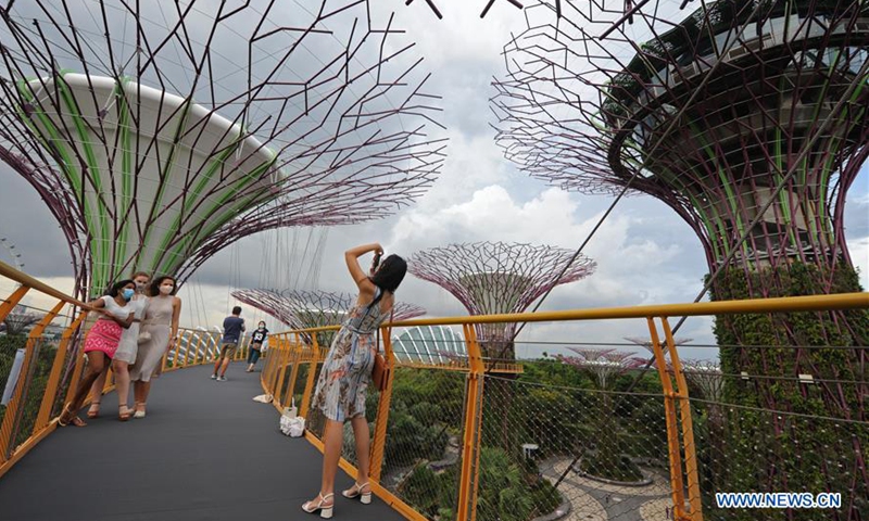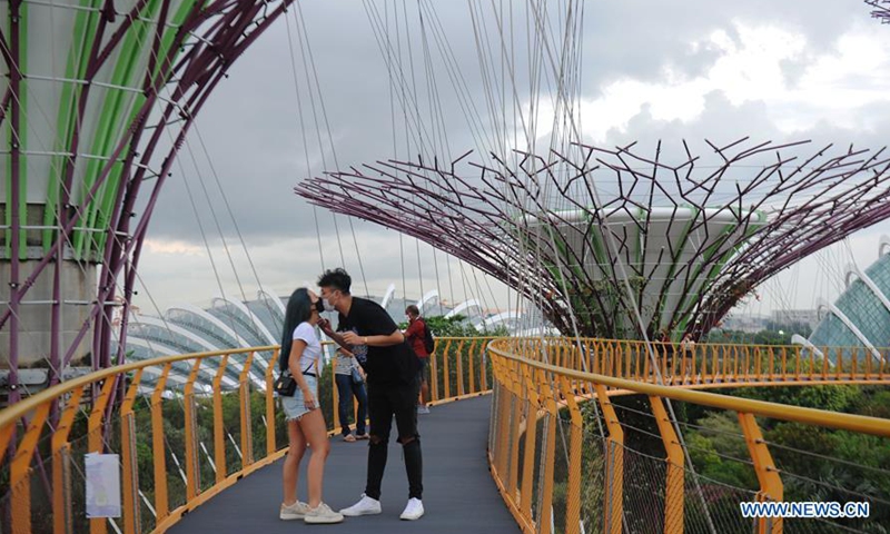 People visit the Supertree grove OCBC Skywalk on the first day of reopening at Singapore's Gardens by the Bay on Sept. 7, 2020. (Photo by Then Chih Wey/Xinhua)
