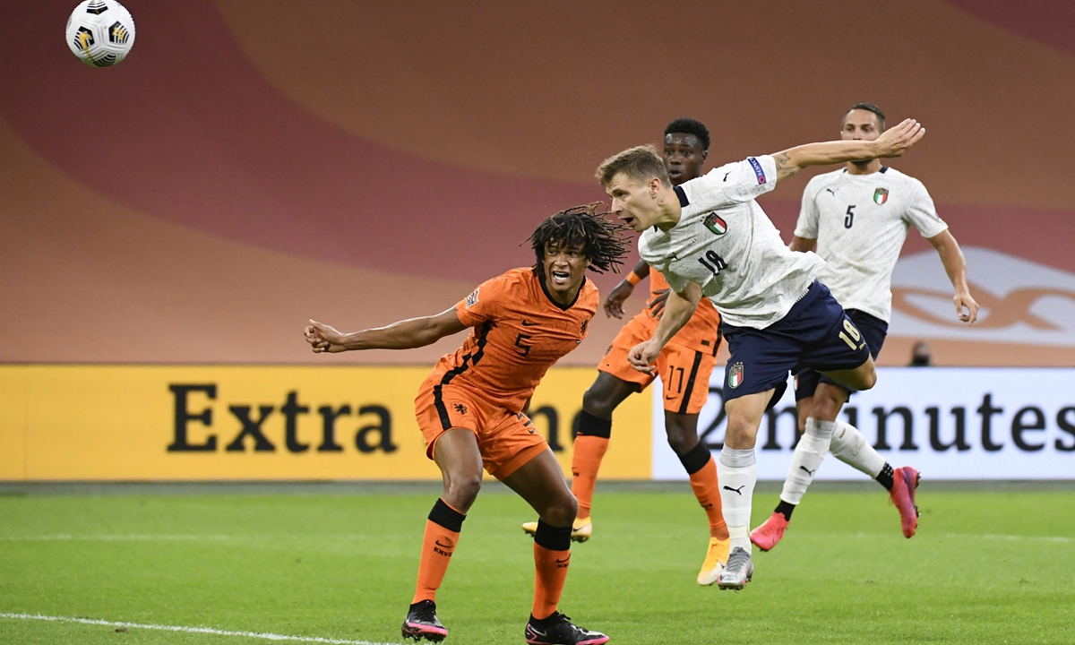 Italy's Nicolo Barella (No.18) scores a header against the Netherlands on Monday in Amsterdam, the Netherlands. Photo: IC
