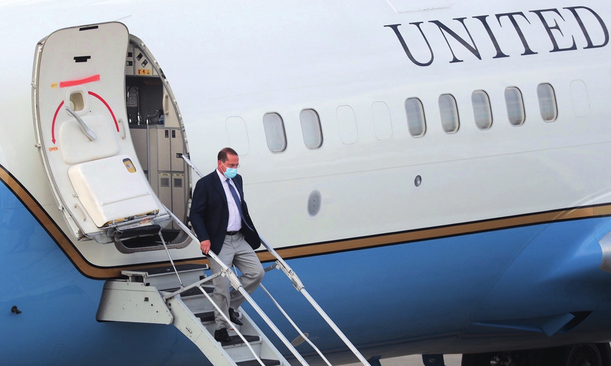 US Health Secretary Alex Azar walks out of a plane as he arrives at the Sungshan Airport in Taipei on August 9, 2020. Photo: AFP