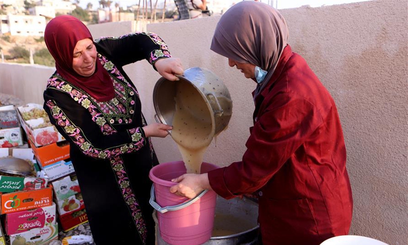 Palestinian women prepare the mixture of grapes and semolina to make grape malban, in the West Bank village of Dura near Hebron, Sept. 8, 2020. Malban is a traditional sweets made from grape juice, sugar and semolina. (Photo by Mamoun Wazwaz/Xinhua)