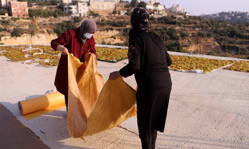 Palestinian women collect sheets of grape malban, a mixture of grapes and semolina, in the West Bank village of Dura near Hebron, Sept. 8, 2020. Malban is a traditional sweets made from grape juice, sugar and semolina. (Photo by Mamoun Wazwaz/Xinhua)
