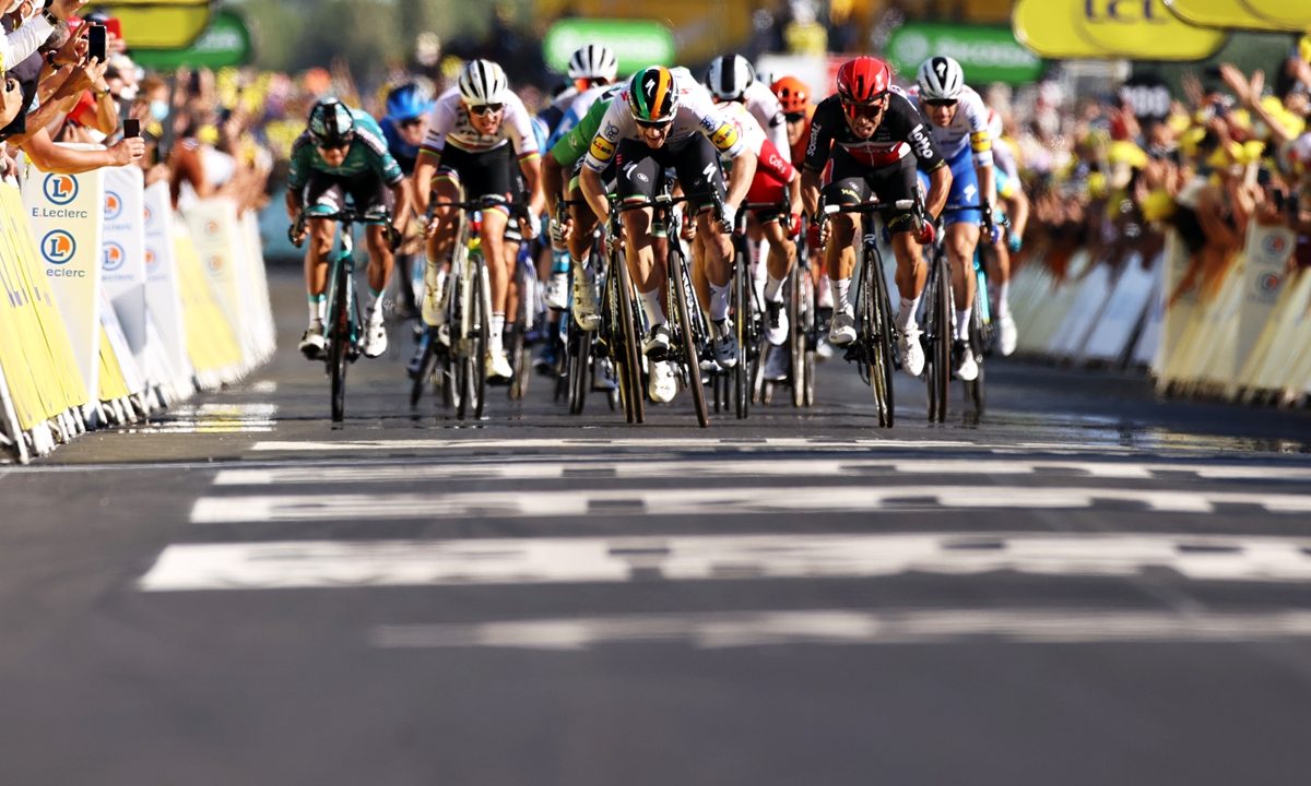 Sam Bennett (center) sprints to win the 10th stage of the Tour de France on Tuesday. Photo: VCG