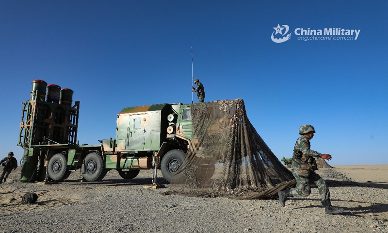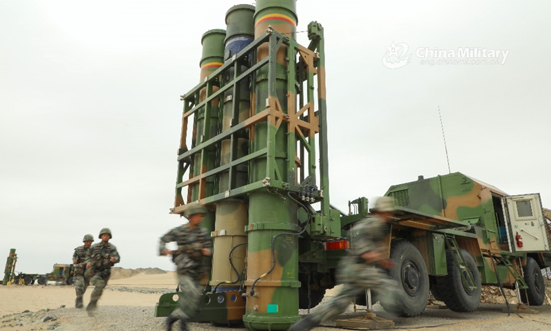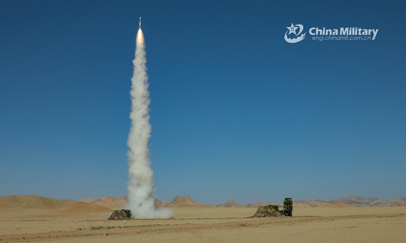 An HQ-16 medium-range air-defense missile system attached to an air defense brigade under the PLA 77th Group Army launched a rocket into the air at a military shooting range in desert area in late August, 2020. (eng.chinamil.com.cn/Photo by Hu yonghui)