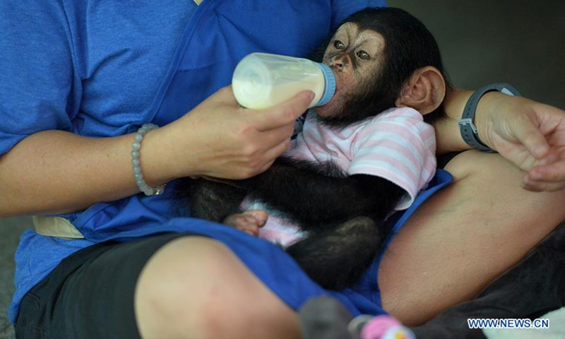 A woman feeds a baby chimpanzee at the Crocodile Farm and Zoo on the outskirts of Bangkok, Thailand, Sept. 9, 2020. (Xinhua/Rachen Sageamsak)