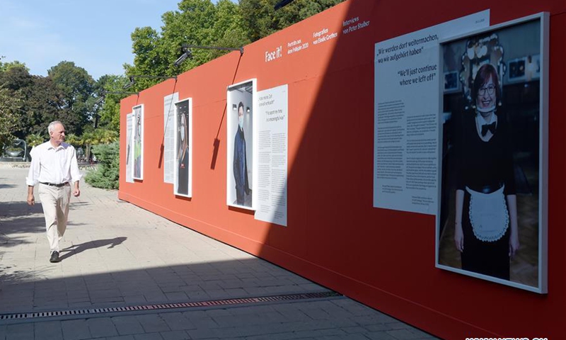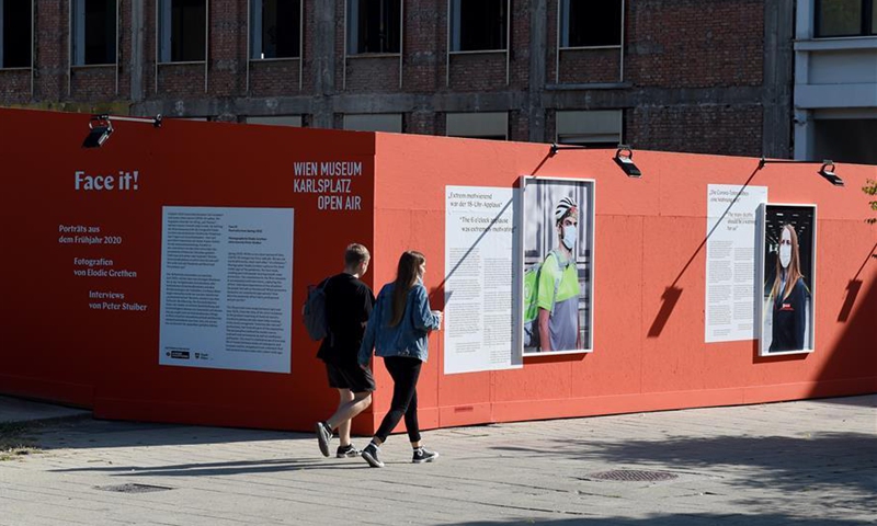People are seen at an exhibition entitled "FACE IT-Portraits from Spring 2020" on Karlsplatz in Vienna, Austria, on Sept. 10, 2020. "FACE IT-Portraits from Spring 2020" is a portrait photography exhibition held by the Vienna Museum. (Xinhua/Guo Chen)