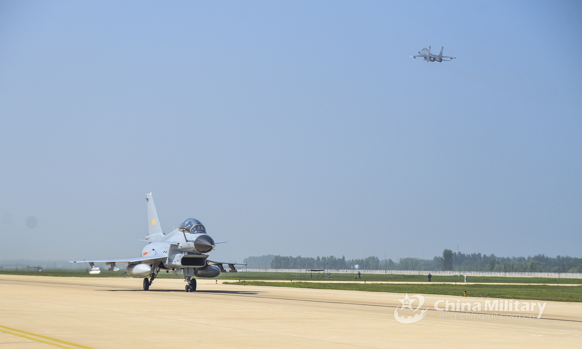 A J-10 fighter jet attached to an aviation regiment under the PLA Air Force taxis on the runway as another fighter jet takes off during a flight training exercise in late July, 2020. Photo:China Military