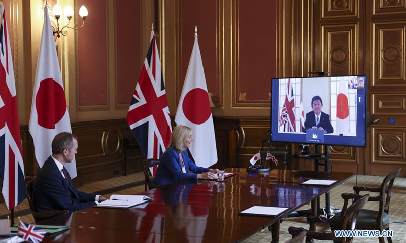 Britain's International Trade Secretary Liz Truss (2nd L) holds a video conference with Japan's Foreign Minister Toshimitsu Motegi (on the screen) in London, Britain, on Sept. 11, 2020. Britain and Japan on Friday secured a free trade agreement, which is Britain's first major trade deal as an independent trading nation after Brexit, the British government said Friday. (Andrew Parsons/No 10 Downing Street/Handout via Xinhua)