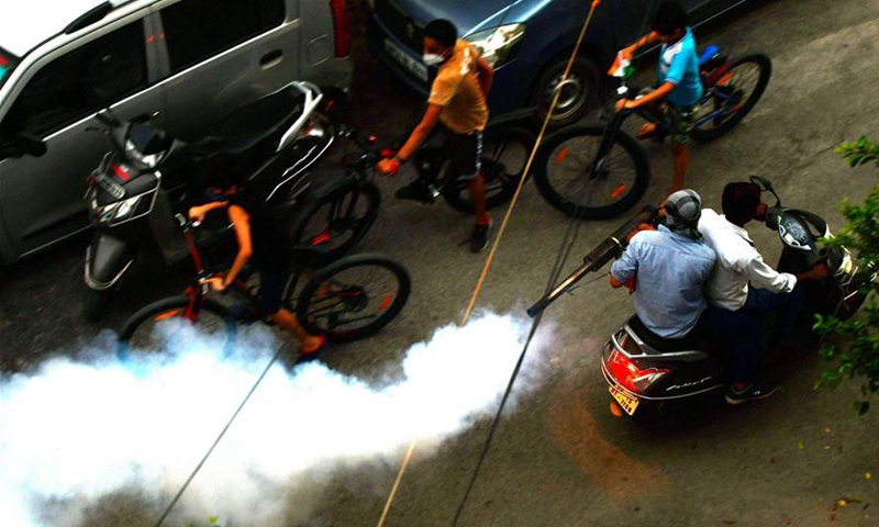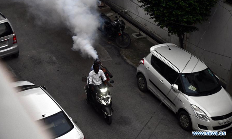 A municipal worker fumigates a street with mosquito repellent to prevent dengue in Noida, Uttar Pradesh, India, on Sept. 12, 2020. (Photo by Partha Sarkar/Xinhua)